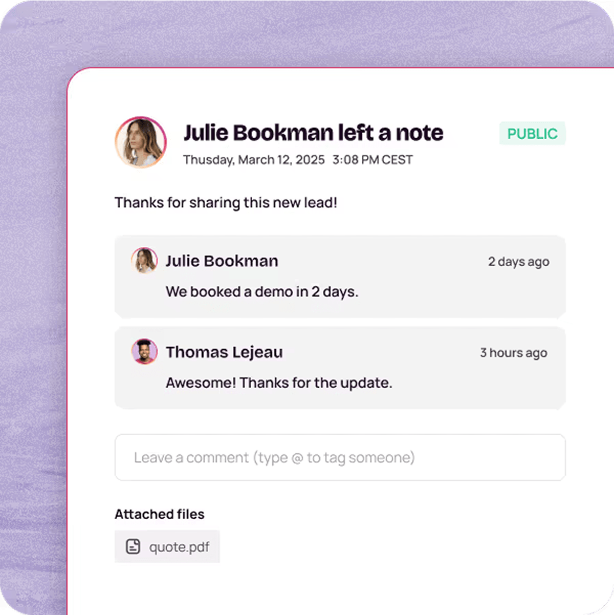 - Shared PipelineSee deal progress in real-time and collaborate on strategy