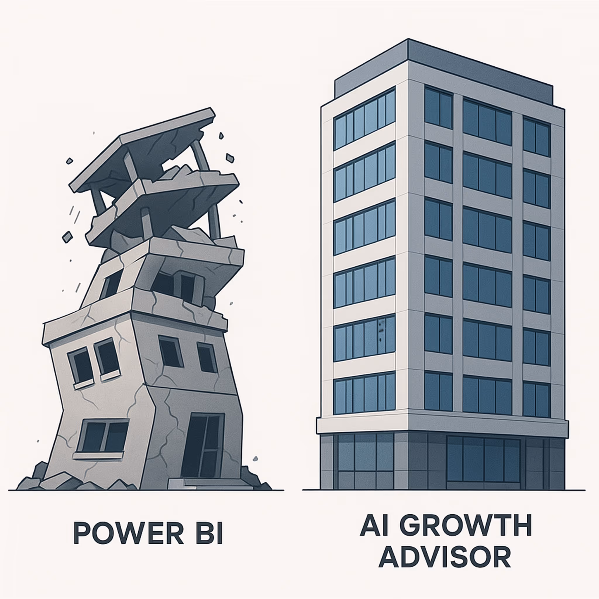 Power BI is like a two-story building not designed to support added stories—it collapses under the weight of multi-unit reporting. It was designed for big corporate business reporting, not a multi-unit system. If you try to make it that, you will suffer major pain and spend hundreds of thousands of dollars, and you will most likely fail.