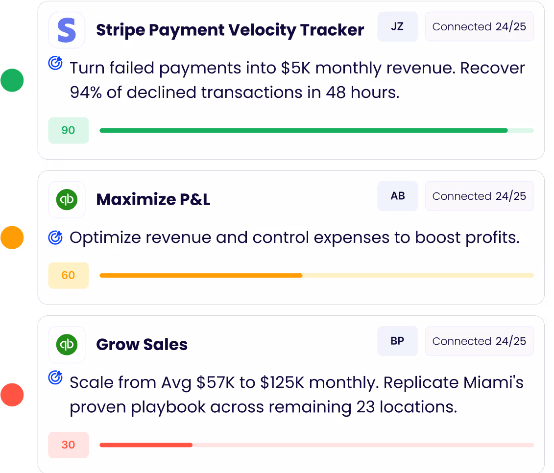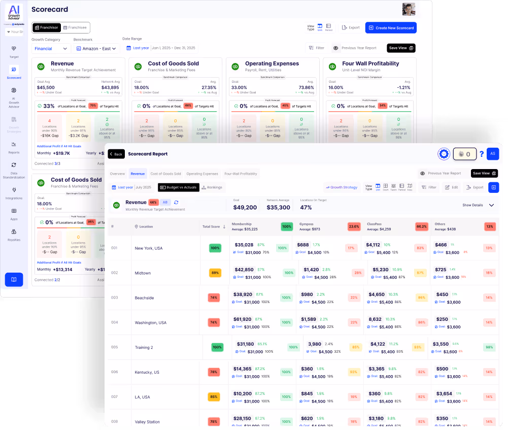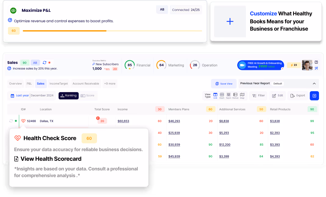 See How I Connect Your AppsI bring all your data together—whether from 500+ apps like QuickBooks, Salesforce, and HubSpot, or from the inputs you share. Everything lives in one simple dashboard, so you can track, compare, and understand your business in real time. From 1 to 1,000+ locations, you’ll see clear next steps to grow faster.