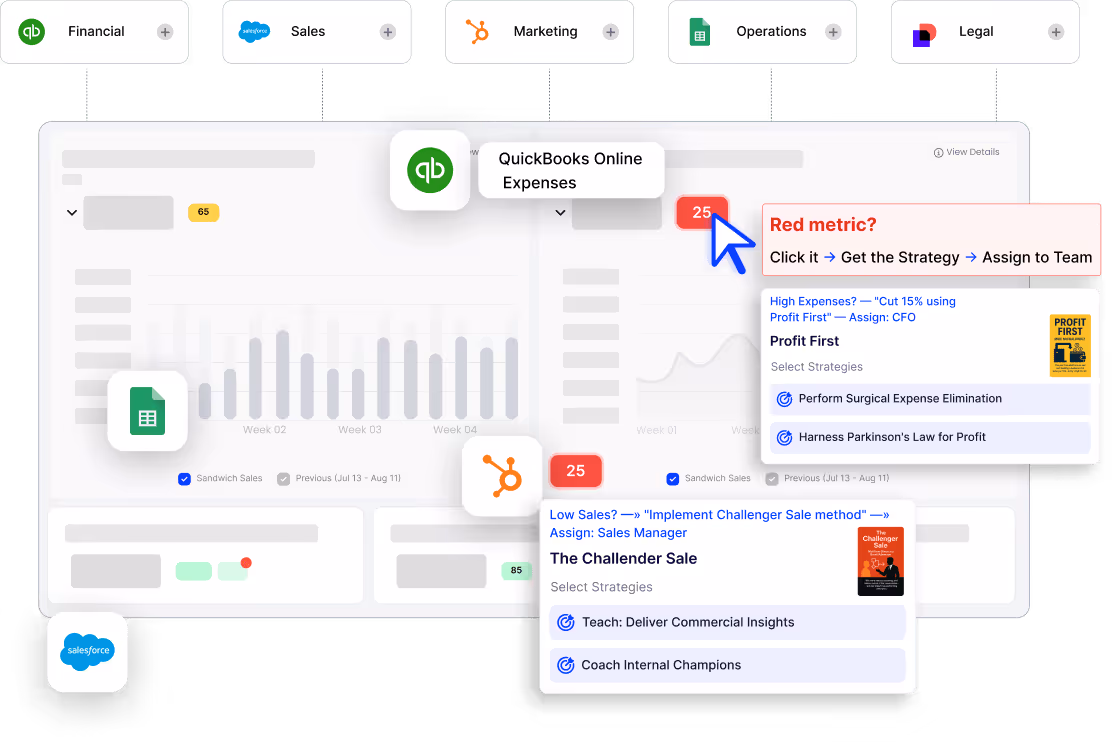 See How I Consolidate Your DataI turn your goals, metrics, and challenges into a Smart Scorecard—powered by strategies from 1,500+ top business books. You get clear insights, ownership, and action steps for every team, department, and location—so hitting your goals becomes faster and easier.